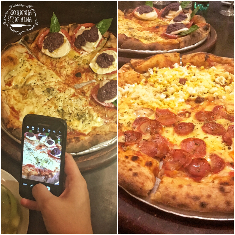 Sei que vocês devem estar curiosos para saber sobre as redondas, mas antes vou falar das entradas. Foram servidos: pão de calabresa, pizza branca e dona rosa (massa de pizza enrolada assada e recheada com caponata, ricota, mussarela, parmesão e tomate em cubos). Uma delícia, vale a pedida. Se você não for com muita gente e quer comer só uma entrada, não deixe de experimentar a dona rosa (#dicadegordinhadealma).
