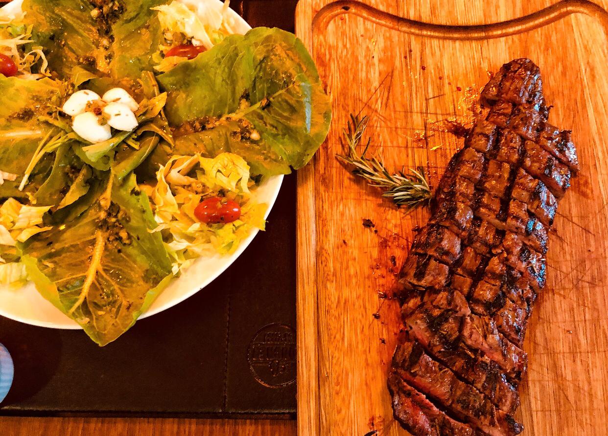 A casa também conta com um restaurante num ambiente super agradável. Fui recepcionada por um dos donos, o Rodrigo Suassuna, que apresentou alguns cortes e recomendou que eu provasse Tapa del Ancho. As carnes são servidas com chimichurri da casa + farofinha. Para acompanhar, eu escolhi batatas ao murro com molho de ervas(R$17) + mix de folhas com queijo boursin e tomate cereja(R$25).