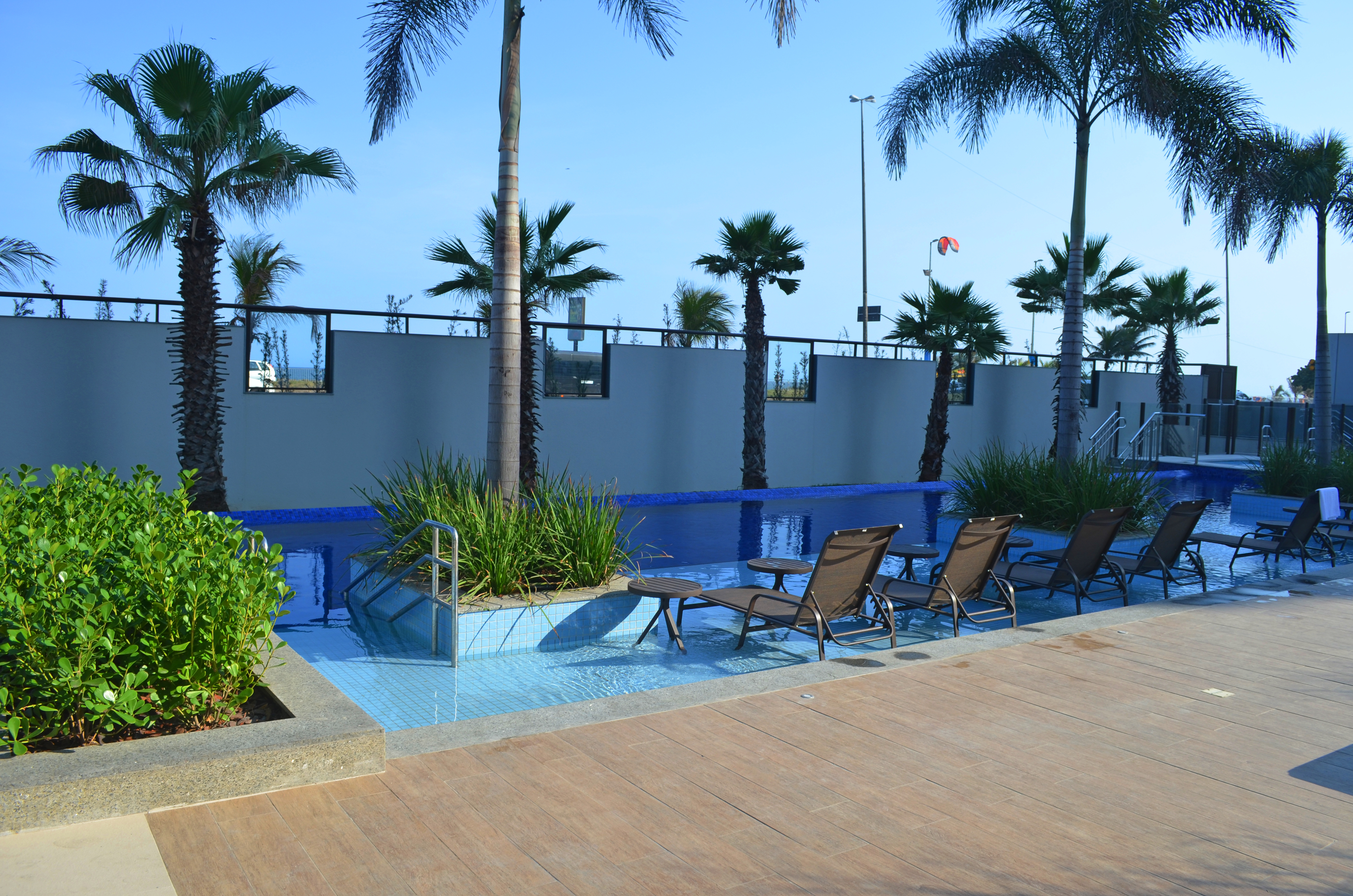 Agora vou falar da área que todo mundo ama quando chega no hotel: a piscina. No Pestana, a ideia é que o hóspede se divirta pra valer, oferecendo entretenimento com conforto, por isso a piscina será um ponto de encontro para um drink e um hot spot para festas ao final do dia ao estilo de Ibiza e Miami.
