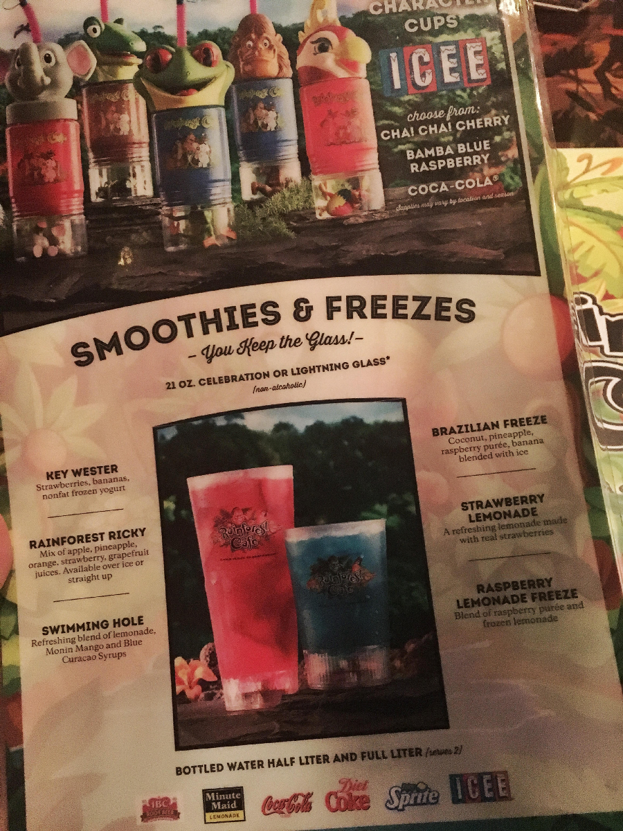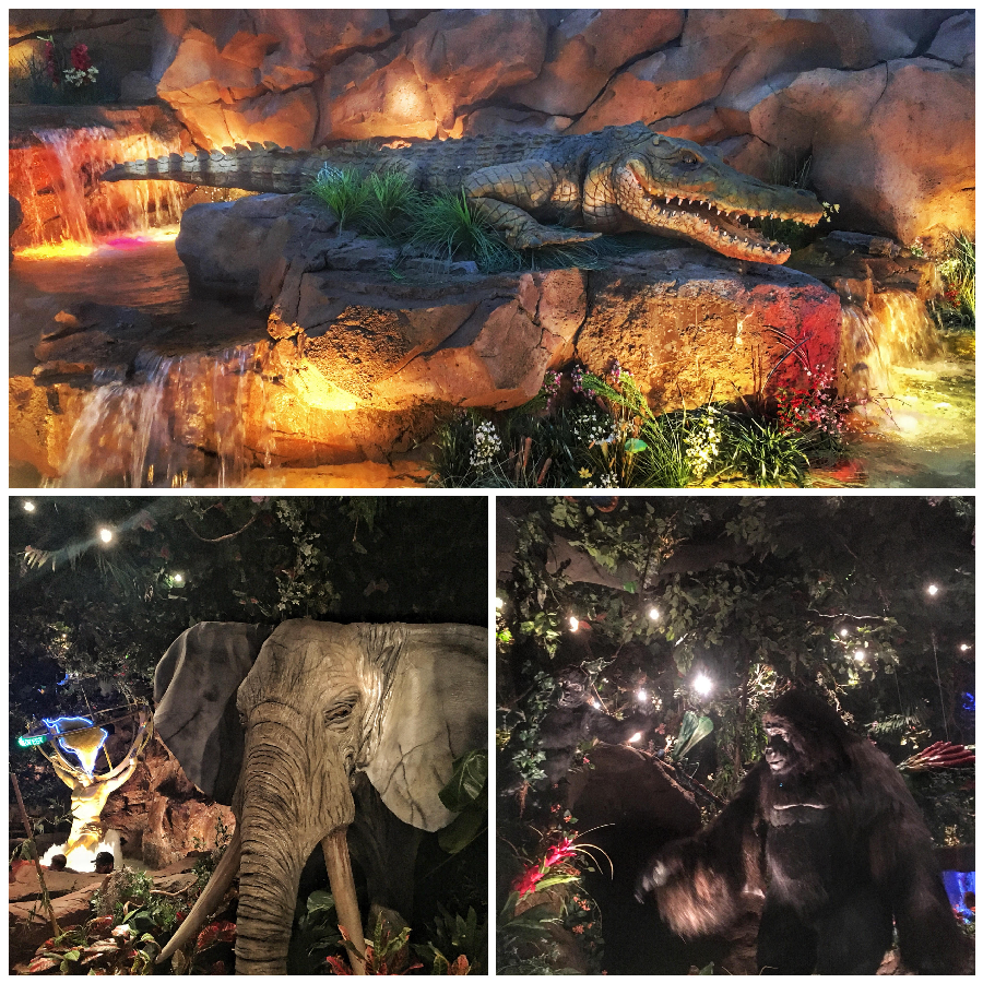 O RainForest Cafe é um dos restaurantes que chamou bastante minha atenção durante minha viagem a Orlando. É uma rede de restaurantes americana presente em vários estados, e que ganhou unidades também em outros países. Em Orlando, você encontra o restaurante na entrada do Animal Kingdom e em Disney Springs(unidade visitada por mim). A decoração do restaurante é encantadora, o vulcão é ativado de tempos em tempos despertando os olhares de todos que circulam pelo local. Enquanto do lado de fora sai fogo, dentro do restaurante acontece uma mini tempestade, o ambiente fica mais escuro e os animais de decoração começam a ficar agitados. Você se sente numa verdadeira selva, rodeada por gorilas, elefantes, e outros bichos.