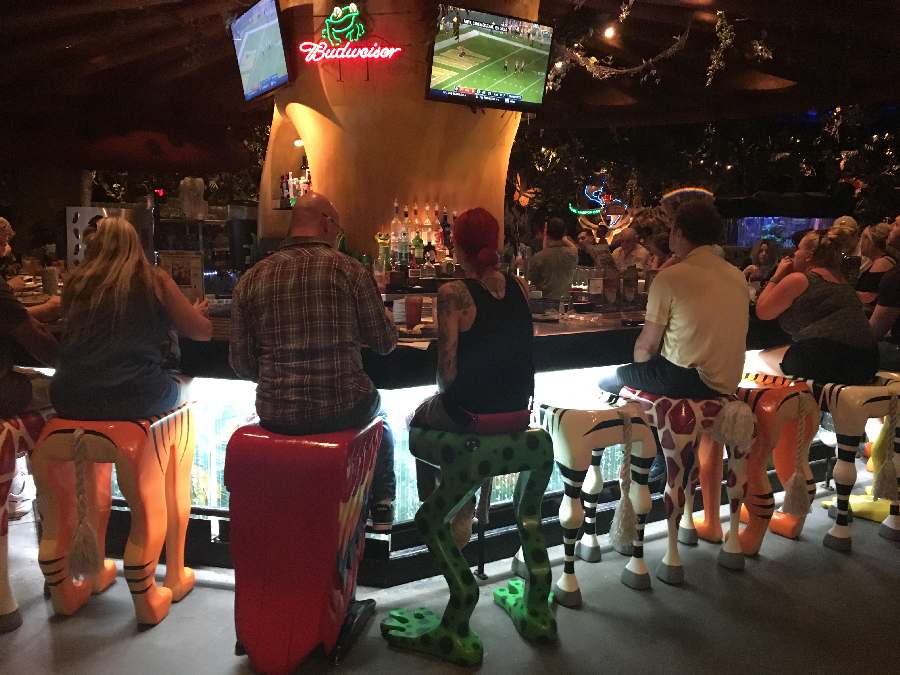 Você pode escolher se quer sentar no bar ou na área do gorila ou do elefante. No bar, os assentos são decorados com as pernas dos animais. Maravilhoso, né? Você faz sua refeição se sentindo meio humano e meio animal (risos).