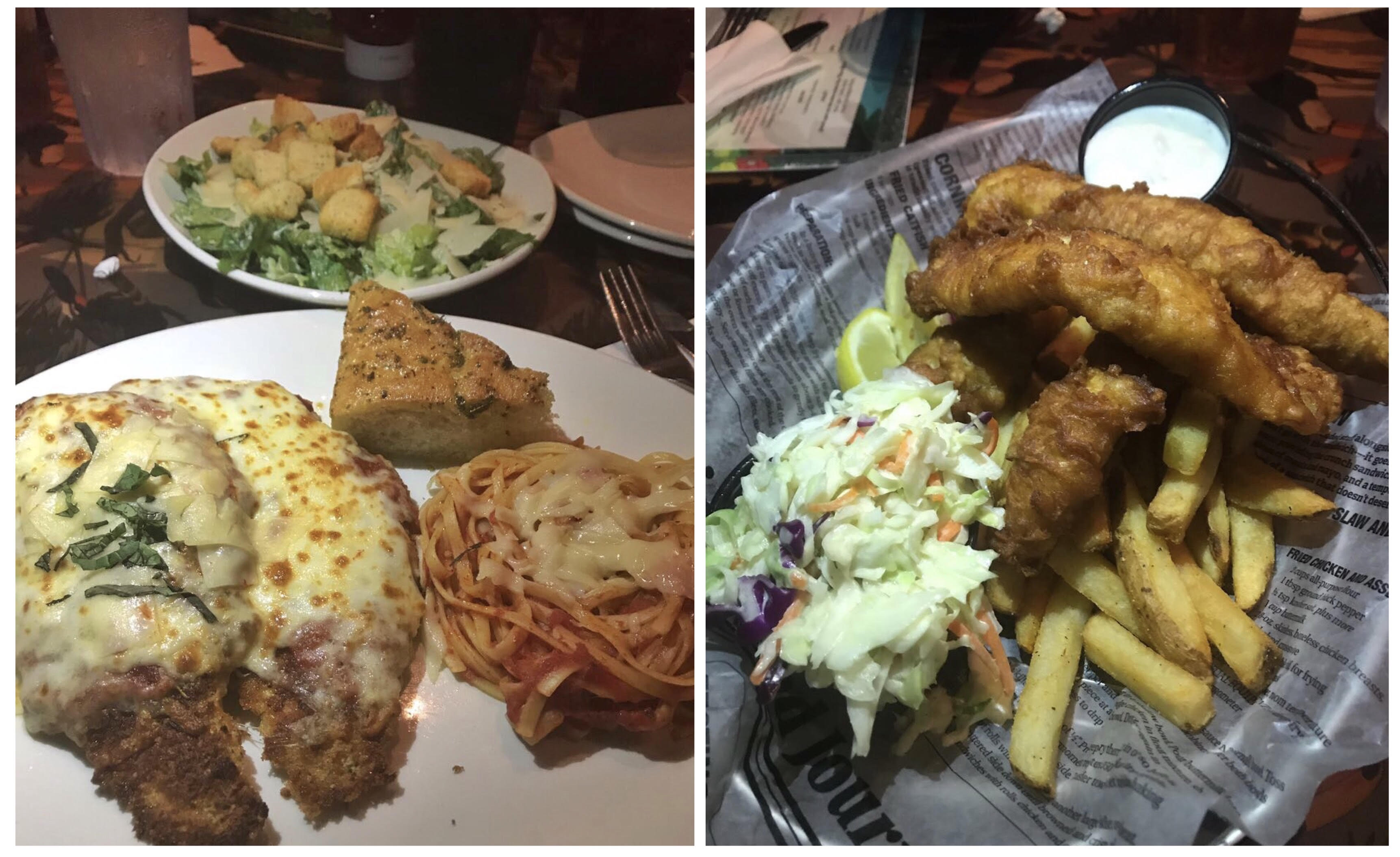 Agora vou falar sobre a COMIDA do RainForest Cafe <3 O cardápio é bem variado, com opções para todos os gostos. Tem hambúrguer, sanduíches, massas, frutos do mar, comida mexicana, sopas, saladas e carnes. O difícil é escolher o que comer com tanta opção. Eu optei pelo PARMESAN CHICKEN (with marinara suave, mozzarella cheese, linguini). O prato custou $22,99 e ainda pode adicionar sopa ou salada por $6,99 e eu escolhi a caesar salad. O prato é muito bem servido, pode dividir com alguém que não coma muito ou com uma criança, por exemplo. E o melhor: a comida é deliciosa.Minha irmã optou pelo fish-n-chips ($20,99) e estava um pouco apimentado. Se você tem alergia a pimenta ou não curte muito, não recomendo.