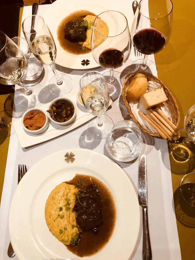 O antepasto é um delicioso Vitello Tonnato (lâmina de lagarto cozido com creme de atum, anchova e alcaparra). Já o primeiro prato é: agnolotti del plin al burro e salvia, uma deliciosa massa recheada(alcatra, lombo suíno, repolho) com manteiga e sálvia. O segunto prato, meu preferido por sinal, é uma fraldinha assada no barolo e especiarias com polenta.